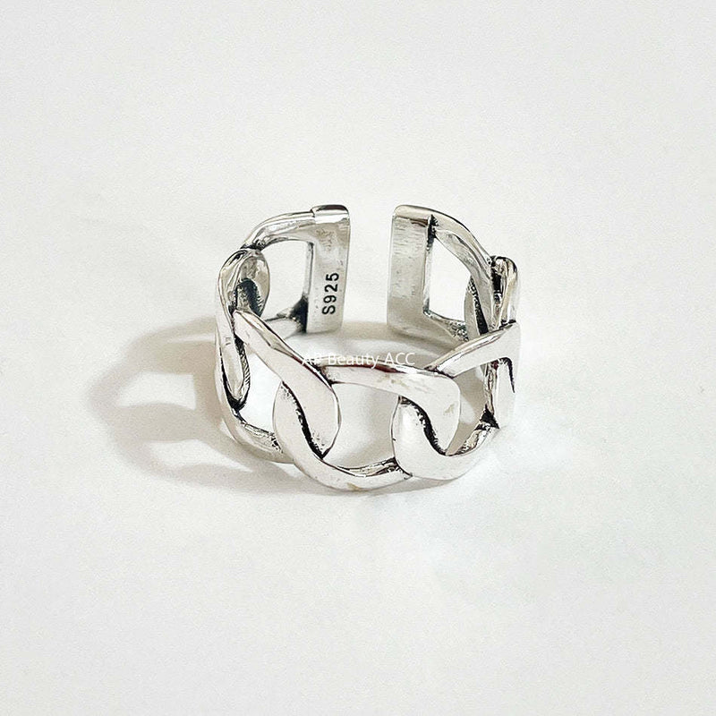 F廠-韓國韓版S925純銀簡約 個性復古泰銀 寬鎖鏈方條開口戒指指環「J549」25.12-2