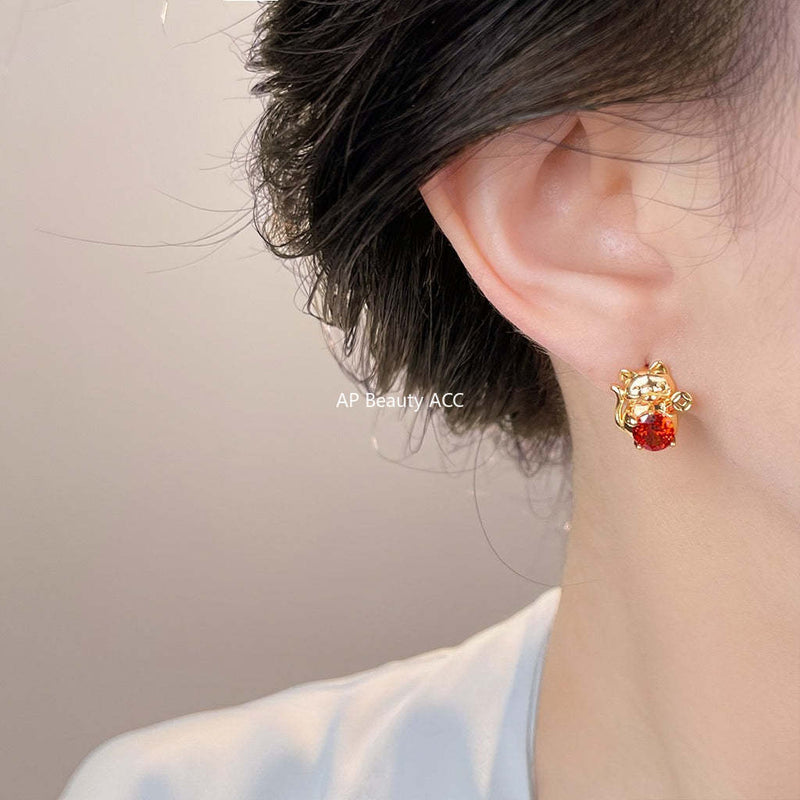 A廠-原創找財貓! 925銀針鑲嵌鋯石個性小眾設計趣味貓咪耳環 耳飾工廠「6990」25.10-5