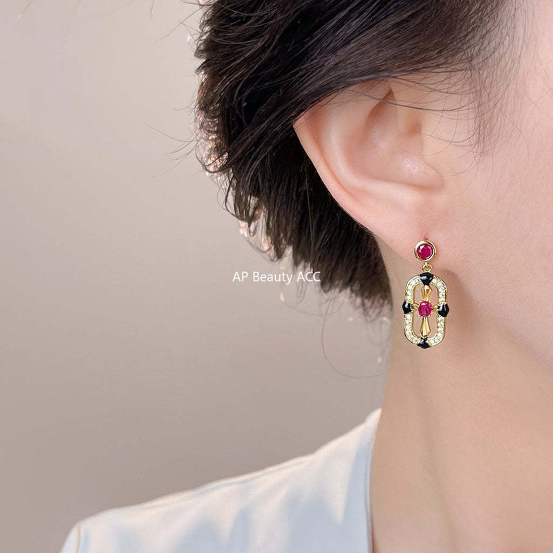 A廠-原創時尚高級感設計師款微鑲鋯石玫紅色小香風新款銀針耳飾耳環女「6985」25.10-5