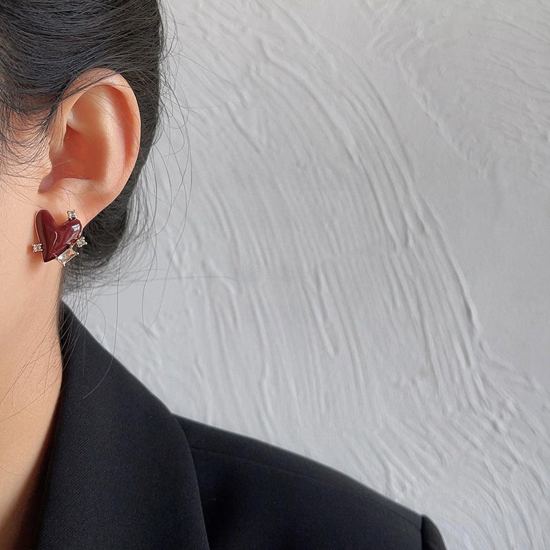 A廠-安可拉紅微鑲鋯石愛心耳環法式復古輕奢高級感心形港風酒紅耳飾品「1533」24.11-1
