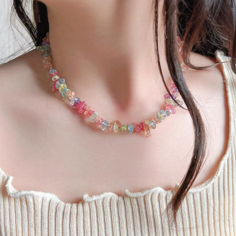 A廠-少女心~夏日新款手作設計感彩色碎晶石玻璃項鍊ins鎖骨鏈頸鍊「1128-1129」24.05-2