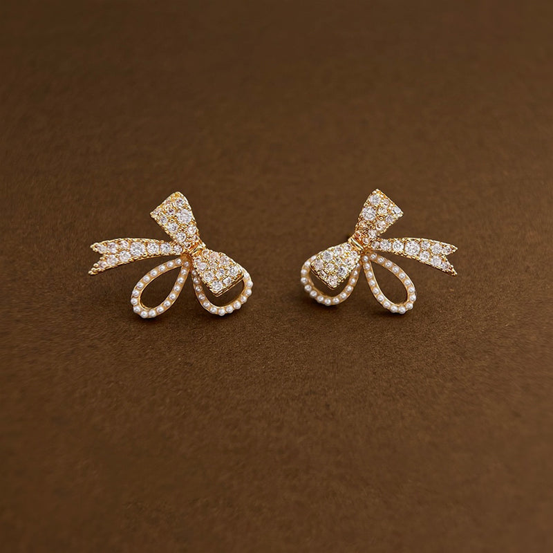 A廠-時尚通勤高級感微鑲鋯石925銀針電鍍14K輕奢風新款蝴蝶結耳飾耳釘「6581」25.08-4