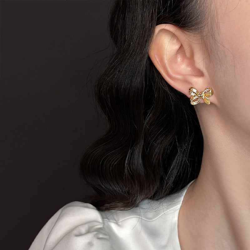 A廠-繩結飄帶 微鑲鋯石925銀針設計師款蝴蝶結幾何耳飾工廠耳環女飾品「6274-6275」25.06-3
