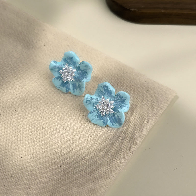 A廠-網路大爆款法式溫柔時尚氣質手繪琺瑯簡齡藍色花朵耳環高級感耳飾「6026」25.05-5