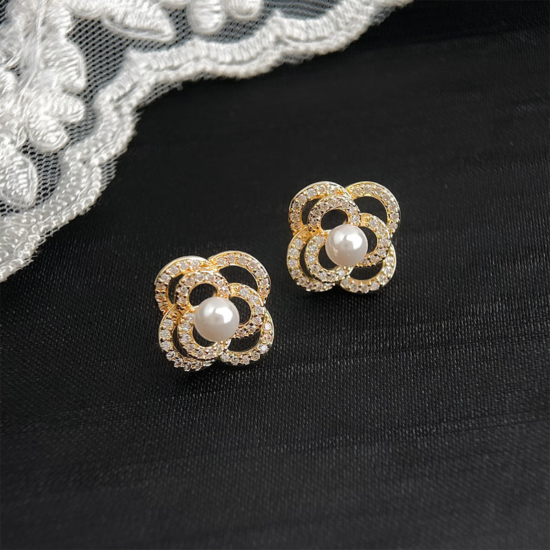 A廠-微鑲鋯石925銀針鍍14K輕奢風高級感立體山茶花耳環工廠耳飾「6041」25.05-3