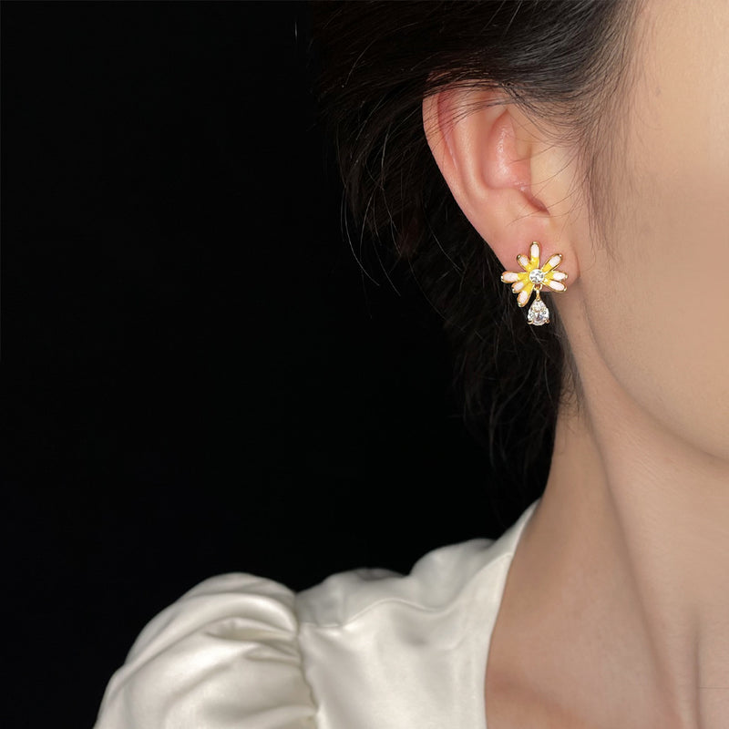A廠-夏日小清新微鑲鋯石925銀針鍍14K琺瑯滴釉漸變色亮黃雛菊耳飾耳釘「6228」25.06-2