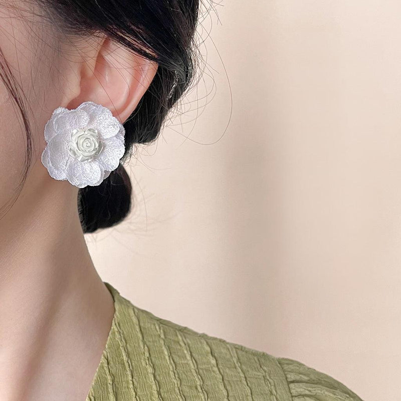 A廠-仙女風甜美清新氣質優雅布藝網紗花朵銀針耳環工廠白色耳環耳飾「4404」24.07-1