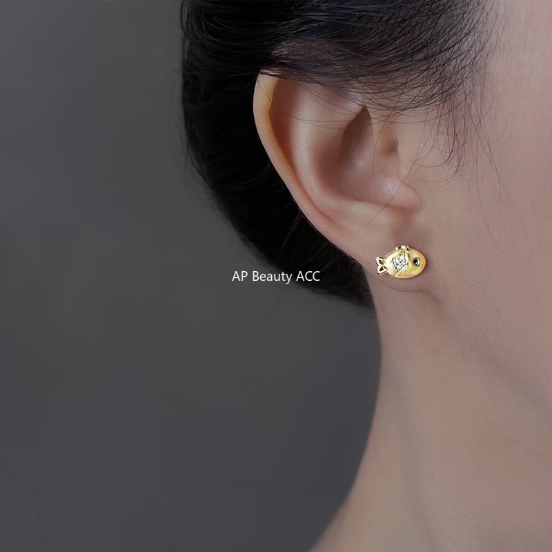 A廠-原始設計不對稱微鑲鋯石925銀針鍍14K小魚與貓咪耳環可愛清新耳飾「6931」25.10-3