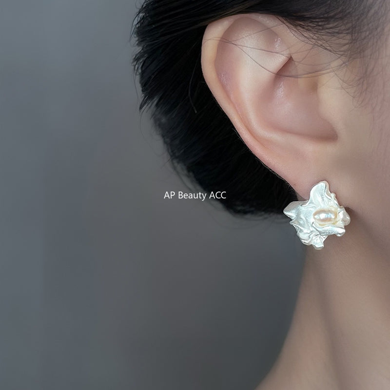 A廠-煙雨小眾設計誇張不規則淡水珍珠液態銀色個性新耳飾工廠耳環女「6852」25.10-3