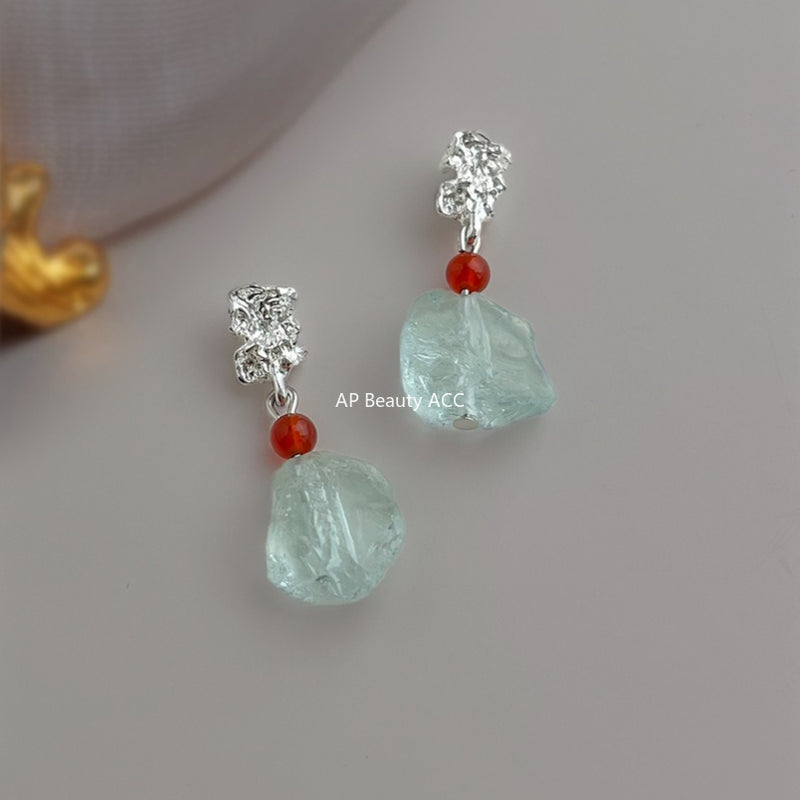 A廠-清冷感水透海藍水晶天然石時尚清新甜美碎石耳環度假風新款耳飾女「6921」25.10-3
