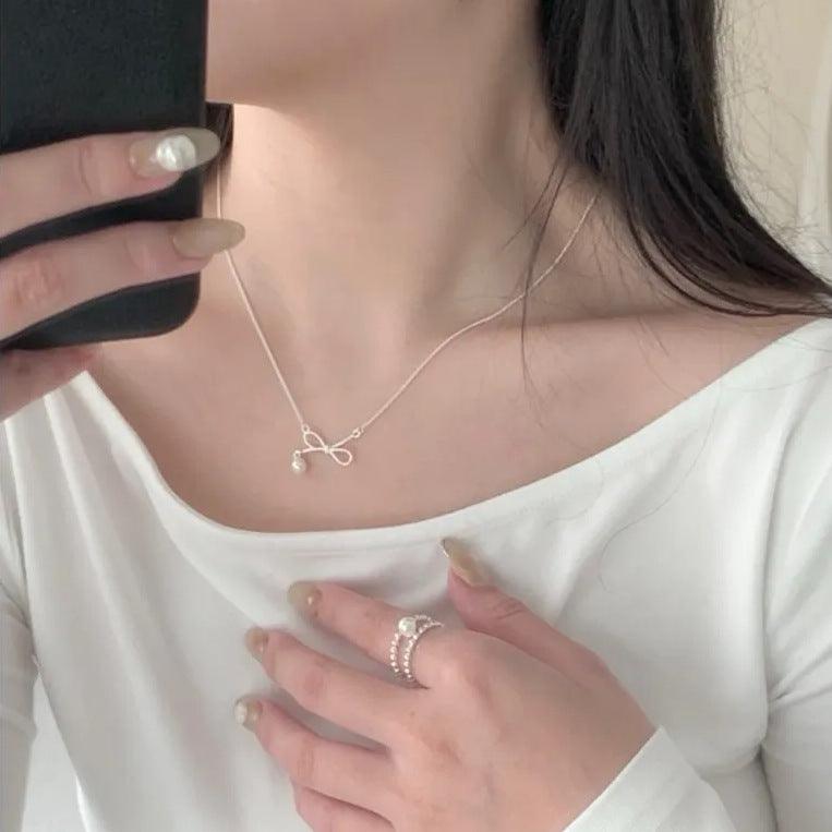 F廠-韓國韓版925純銀蝴蝶結珍珠項鍊簡約冷淡風INS小紅書項鍊「B1233」25.10-3