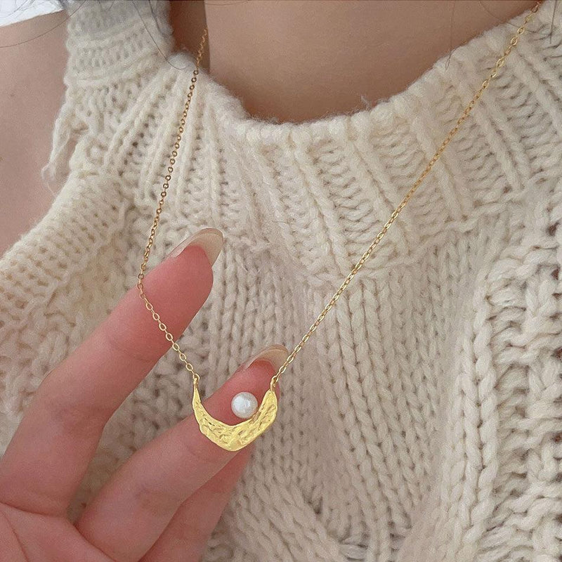 F廠-韓版飾品925純銀殘月珍珠項鍊 金色風格項鍊女款簡約小眾網紅項鍊「B843」25.01-2