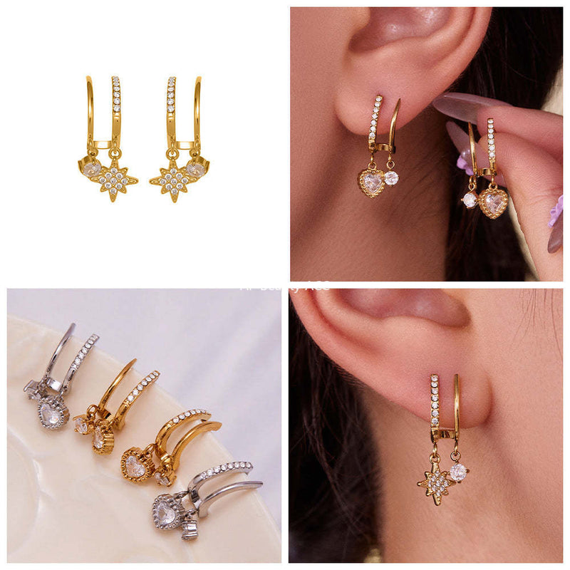 B廠-不鏽鋼5A鋯石雙層爪鑽超閃八芒星吊墜耳環跨境氣質百搭耳飾「F1327」25.10-5
