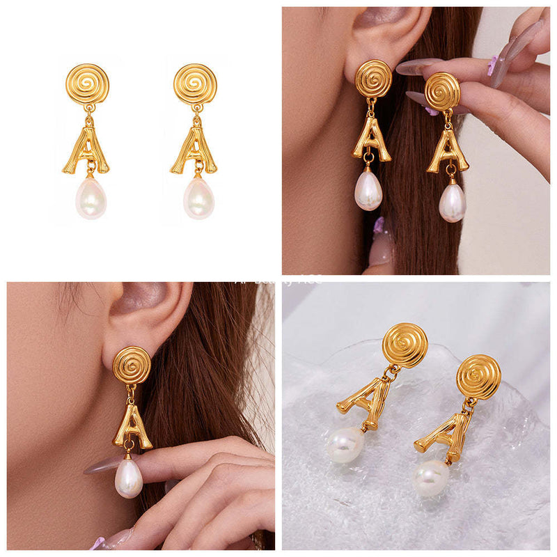 B廠-不鏽鋼螺紋A字母仿珍珠流蘇吊墜耳環鍍18k真金珠寶首飾批發「F1435」25.10-5