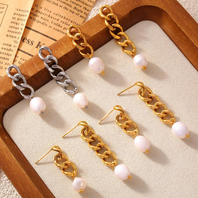 B廠-2024新款歐美長短鏈條流蘇耳釘優雅簡約氣質鈦鋼鍍金淡水珍珠耳環「F344」24.06-3