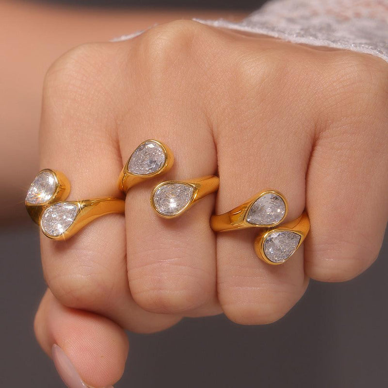 B廠-3A鋯石雙水滴鈦鋼開口戒指PVD電鍍18k真金保色現貨批發女「A682」24.10-3
