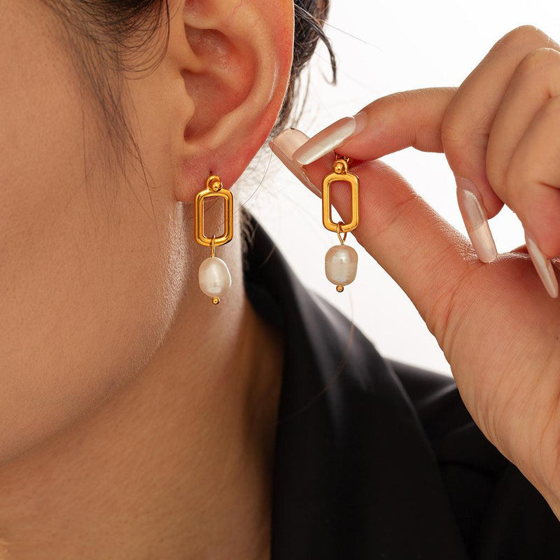 B廠-歐美跨境復古簡約設計淡水珍珠流蘇方形耳環鈦鋼鍍18k金飾品批發「F001」24.10-1
