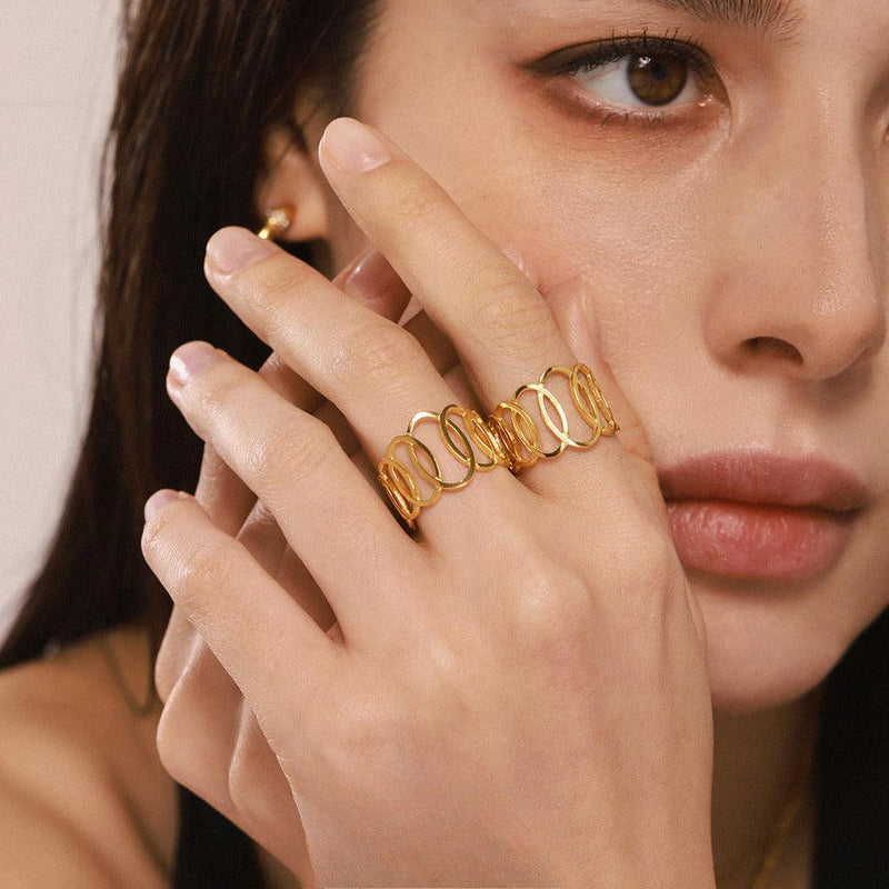 B廠-環環相扣戒指ins冷淡風小眾鏤空圓環交錯不鏽鋼鍍金食指戒「A516」25.03-1