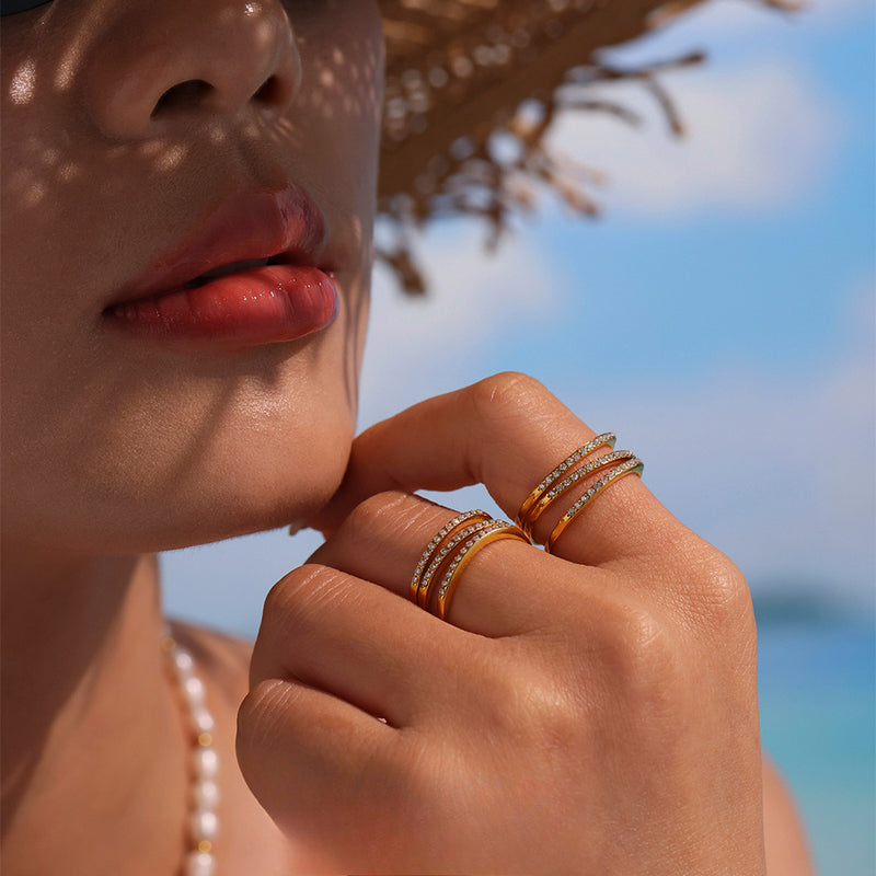B廠-5A鋯石超細三層戒指不鏽鋼真空電鍍18K真金開口可調節飾品「A035-A043」25.04-4