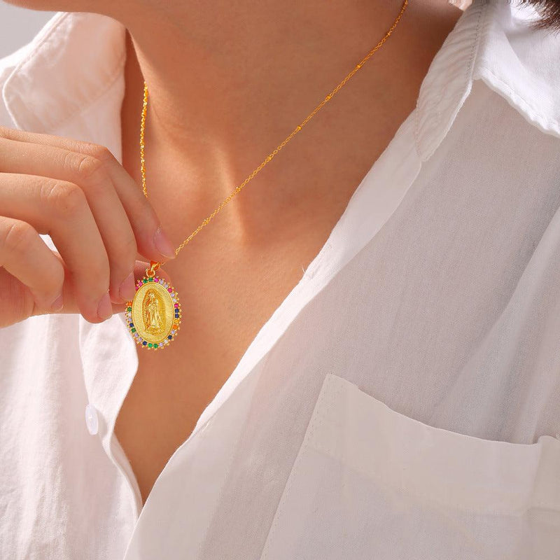 B廠-歐美新款飾品女宗教配飾鑲彩色鋯石聖母瑪利亞銅材質吊墜個性項鍊「P1785-7」24.05-2