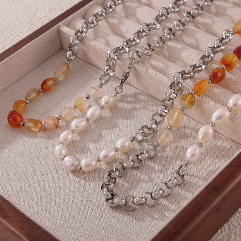 B廠-新款歐美天然石珍珠串珠項鍊女百搭時尚輕奢鈦鋼鍍18k金O字鏈飾品「P1986」24.05-2