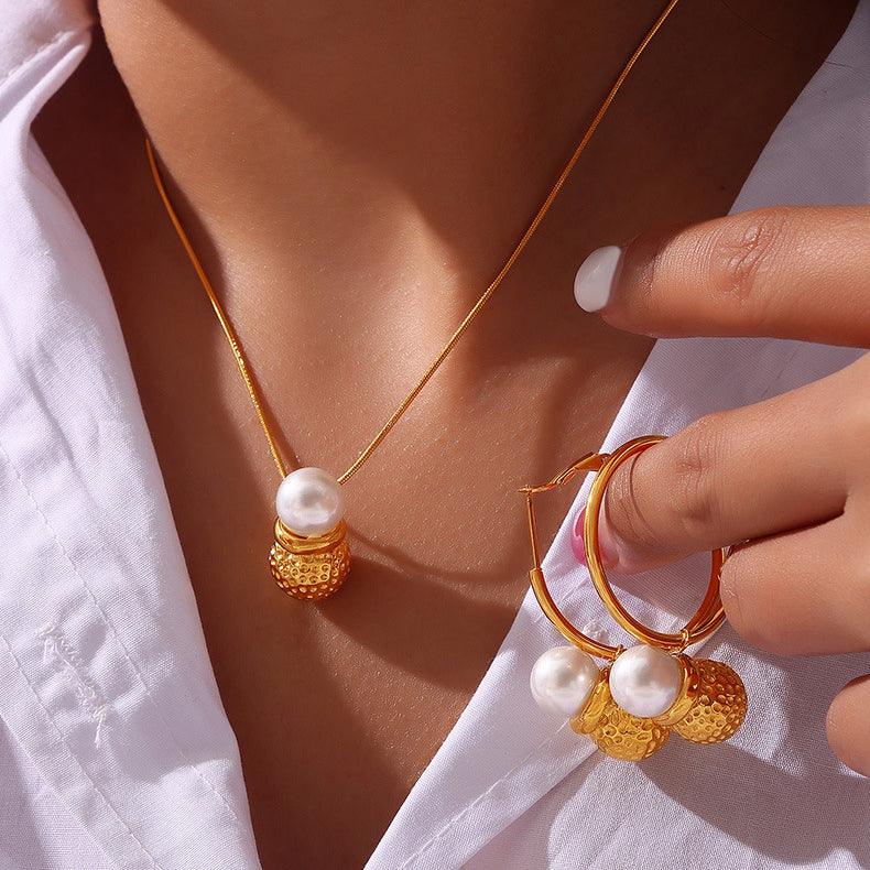 B廠-歐美ins時尚小眾錘紋圓球貝珠拼接吊墜鈦鋼項鍊輕奢氣質耳環套裝「P026-F026」24.04-4