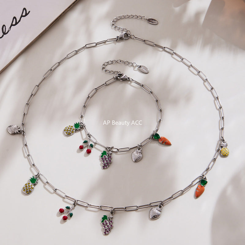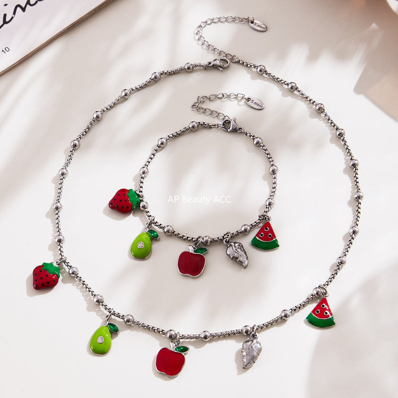 B廠-水果系列鑲嵌鋯石多吊墜歐美風項鍊手鍊腳鏈套裝不鏽鋼材質「TXP414」25.10-1