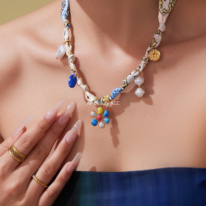 B廠-diy絲巾項鍊 虎眼石仿珍珠頸鏈 小眾設計感打結布條飾品「P2178」25.10-2