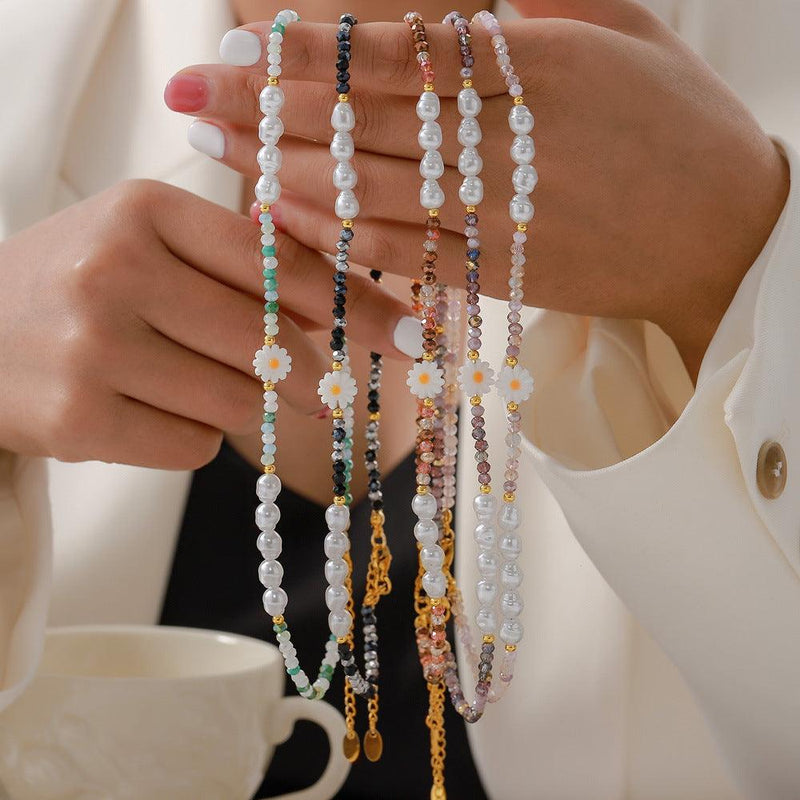 B廠-韓國網紅2024年新款小眾設計感貝珠水晶串珠撞色項鍊女小雛菊鋼珠「P1902」24.06-4