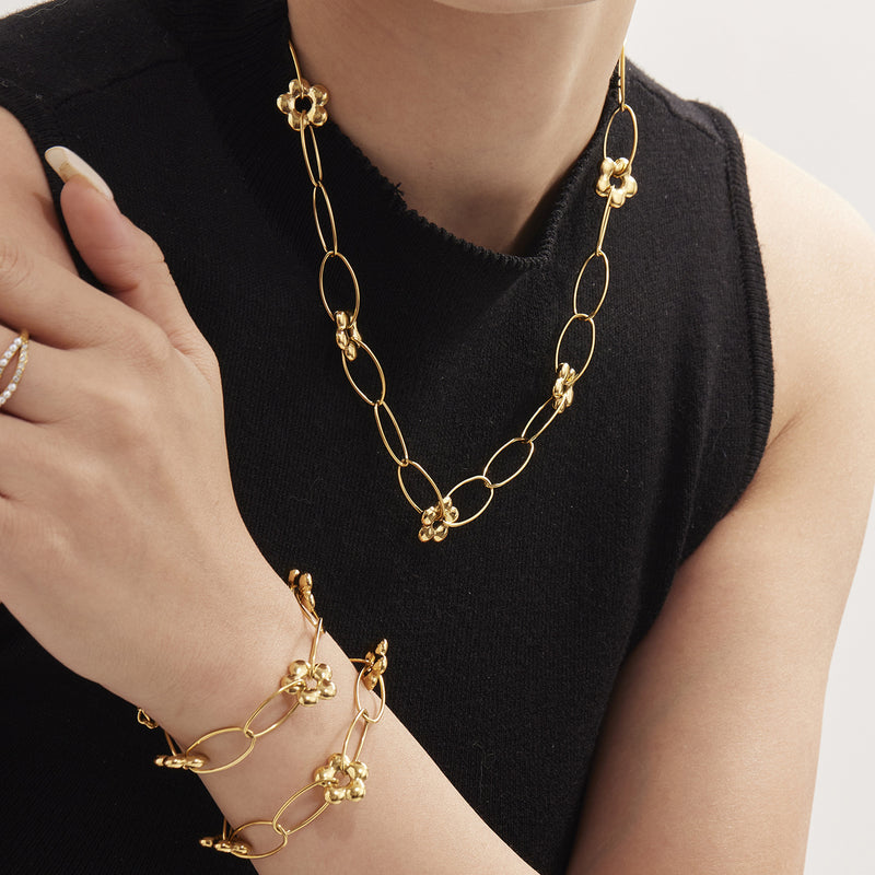 B廠-歐美熱銷新款花朵長圈手工鏈不鏽鋼雙色項鍊手鍊套裝不掉色「TXP356-TXE356」25.08-3