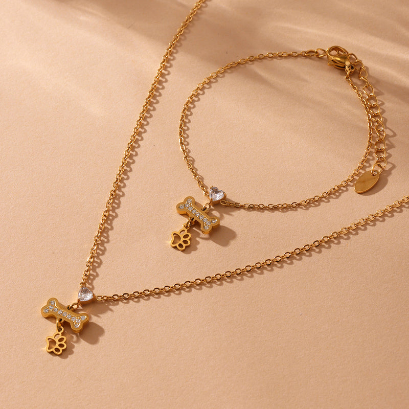 B廠-歐美跨境愛心骨頭鋯石吊墜疊戴鎖骨項鍊手鍊不鏽鋼保色套裝「TXP302-TXE302」25.07-1