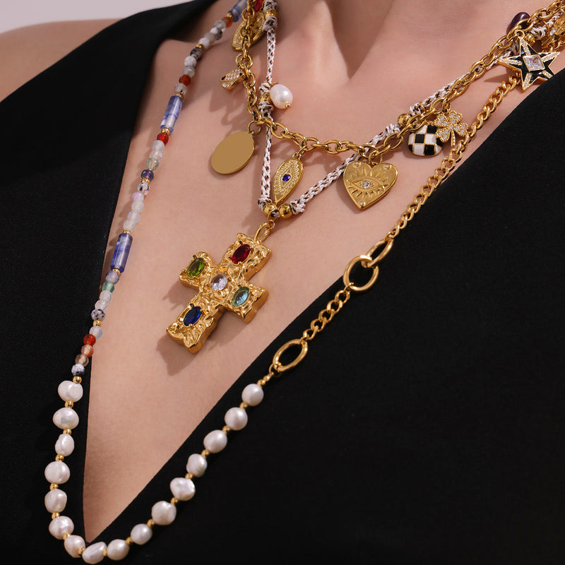 B廠-天然淡水珍珠天然石半寶石長款毛衣鏈彩鑽鋯石十字架項鍊女「P1175-P1239」25.07-4