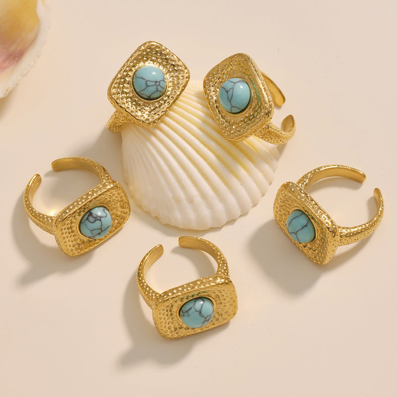 B廠-歐美ins天然藍松石方形項鍊耳環開口戒指時尚鈦鋼18K金套裝「TXP332」25.08-1