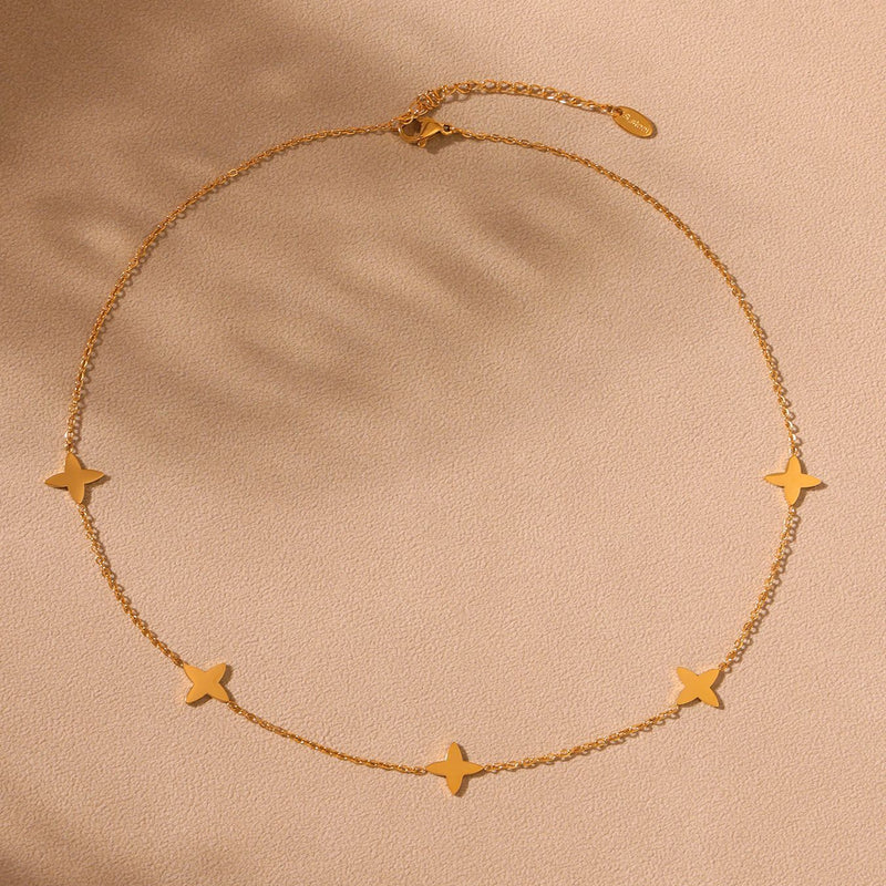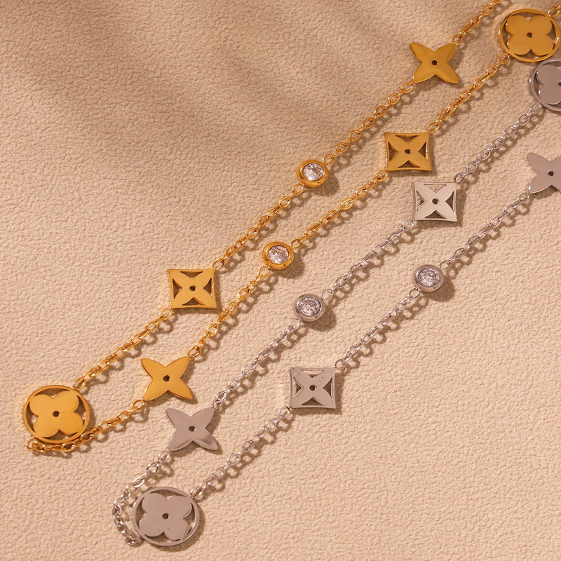 B廠-5A圓珠鋯石疊戴幸運四葉花朵小巧鎖骨鏈輕奢項鍊不鏽鋼頸鏈「P1331-P585」25.05-1