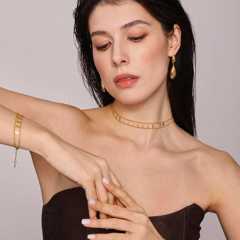 B廠-菱形亮片雙層小眾項鍊手鍊女ins風輕奢簡約不鏽鋼套裝飾品「P555-E262」25.04-1