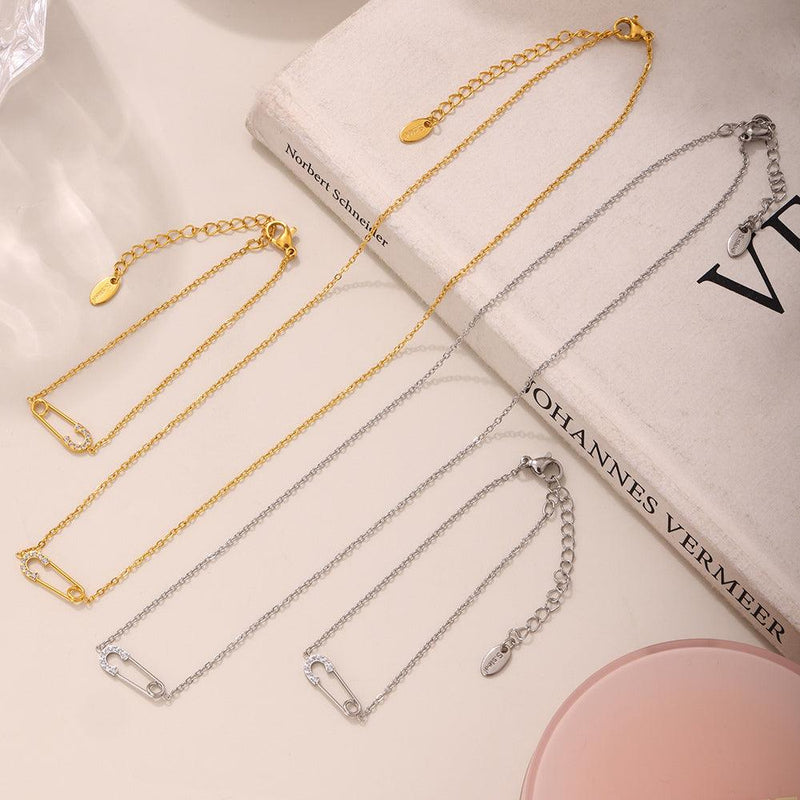 B廠-滿鑽5A鋯石別針不鏽鋼帶鑽項鍊手鍊首飾套裝精緻小巧飾品女「TXP233-TXE233」25.03-4