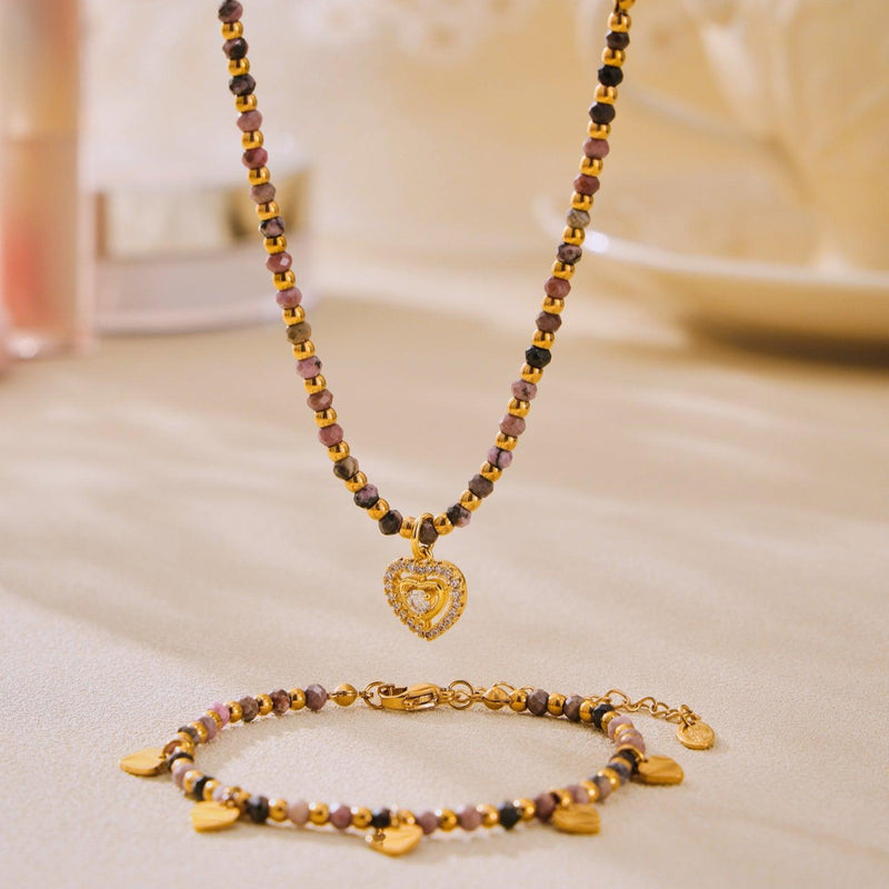 B廠-法式溫柔鎖骨極細天然石小金珠愛心項鍊CHOKER手鍊小眾套裝「TXP243-TXE243」25.04-1