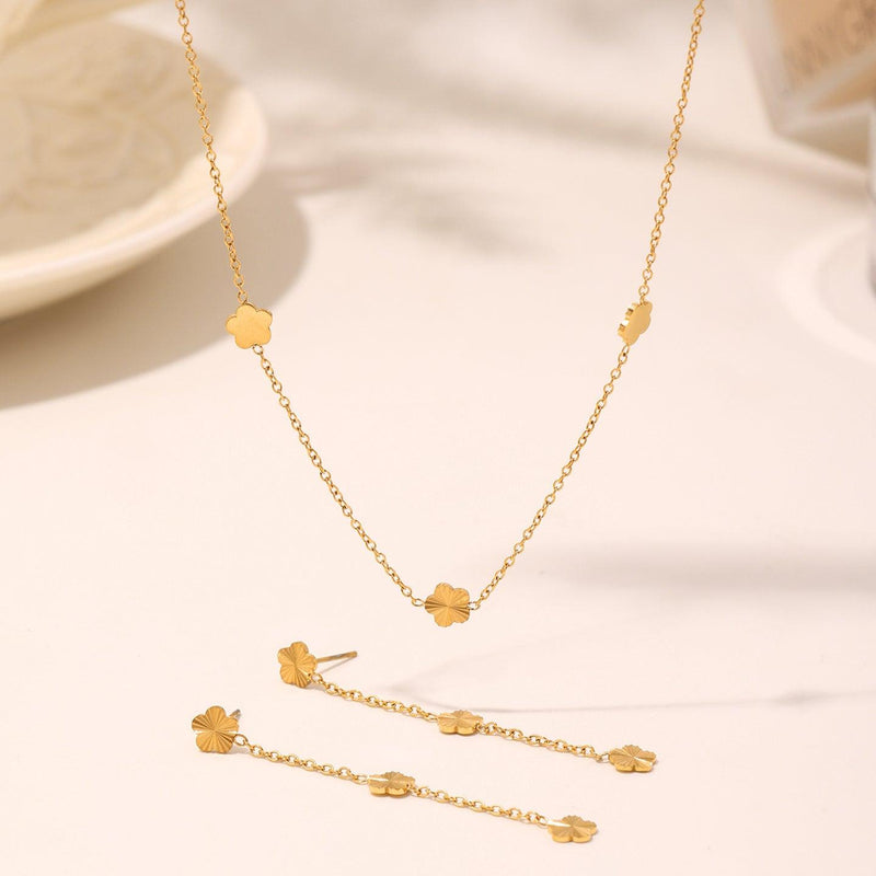 B廠-小花朵鎖骨鏈流蘇耳環套裝不鏽鋼PVD鍍18K真金氣質時尚首飾「P1976-F1421」25.03-2