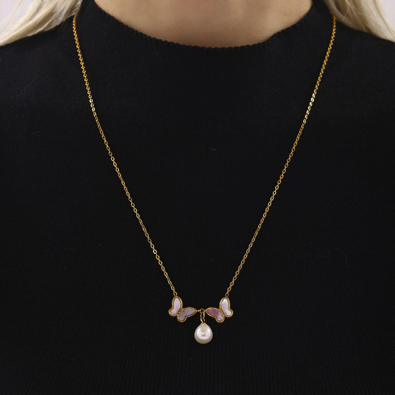 B廠-不鏽鋼天然貝殼雙蝴蝶鑲鑽貝珠鎖骨項鍊PVD電鍍18K真金飾品「P2142」24.12-4