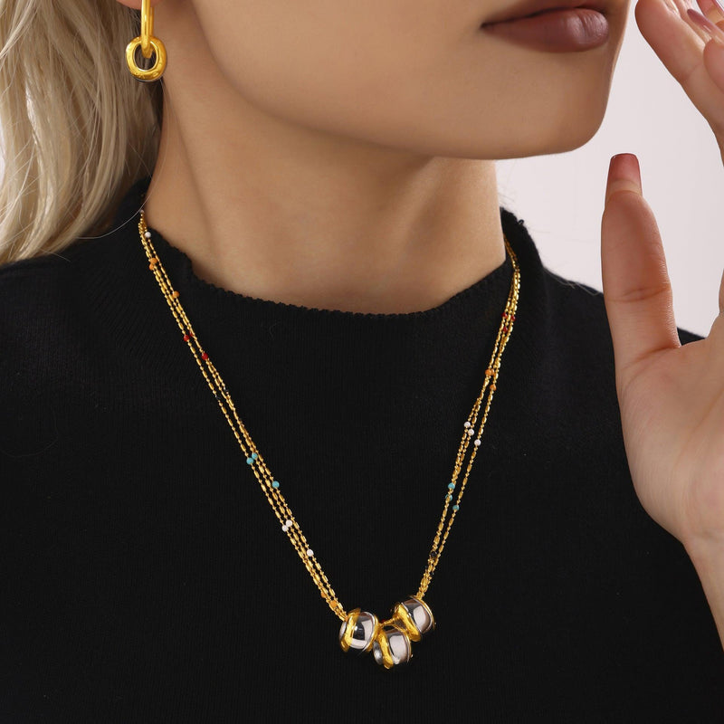 B廠-INS風水滴施家貝珠雙層項鍊不鏽鋼PVD電鍍真金輕奢時尚首飾「P2136-TXP123」24.12-3