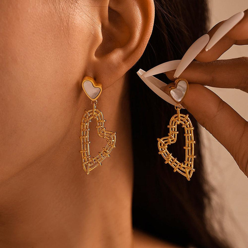 B廠-法式氣質雙愛心白貝鏤空編織耳環項鍊套裝不鏽鋼PVD鍍真金「P2082-F760」24.11-2