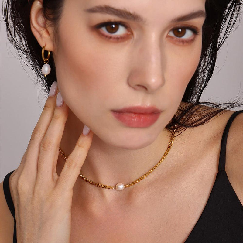 B廠-新款鈦鋼鏈條簡約單顆珍珠項鍊吊墜耳環輕奢氣質鍍18K真金「P539-F340」25.03-4