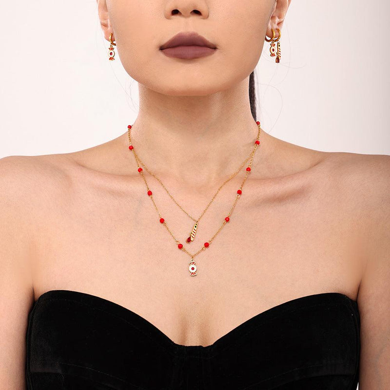 B廠-糖果禮物雙層石榴石不鏽鋼項鍊手鍊不對稱耳環輕奢套裝配飾「TXP187-TXE187-TXF187」24.11-3