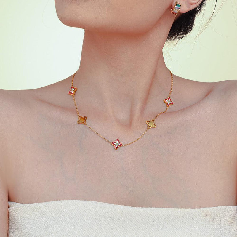 B廠-歐美跨境滴油四葉花鋯石滿鑽手鍊項鍊小眾設計女生款閨蜜鈦鋼套裝「TXP141-TXE141」24.10-2