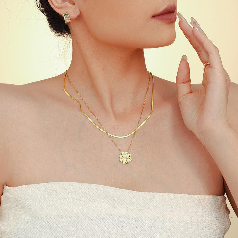 B廠-愛心字母maman微鑲鋯石四葉花雙層鎖骨項鍊鈦鋼氣質飾品女「P2073-P1694」24.10-2