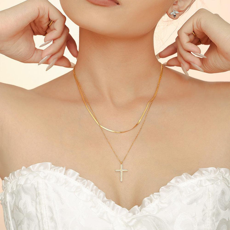 B廠-斜紋十字架鋯石吊墜項鍊女ins小眾疊戴鈦鋼鎖骨鏈批發「P2069-P1694」24.10-2