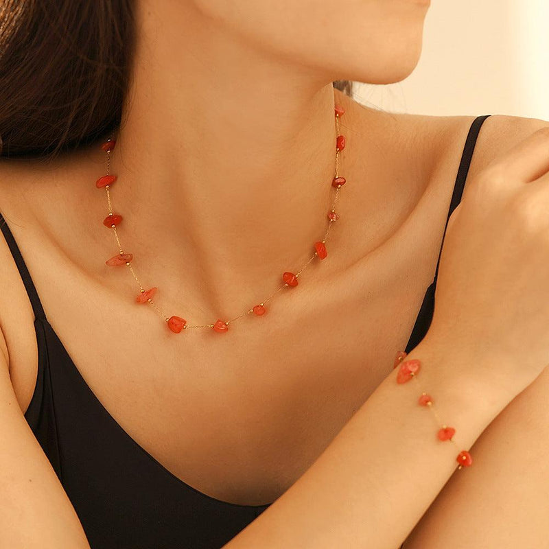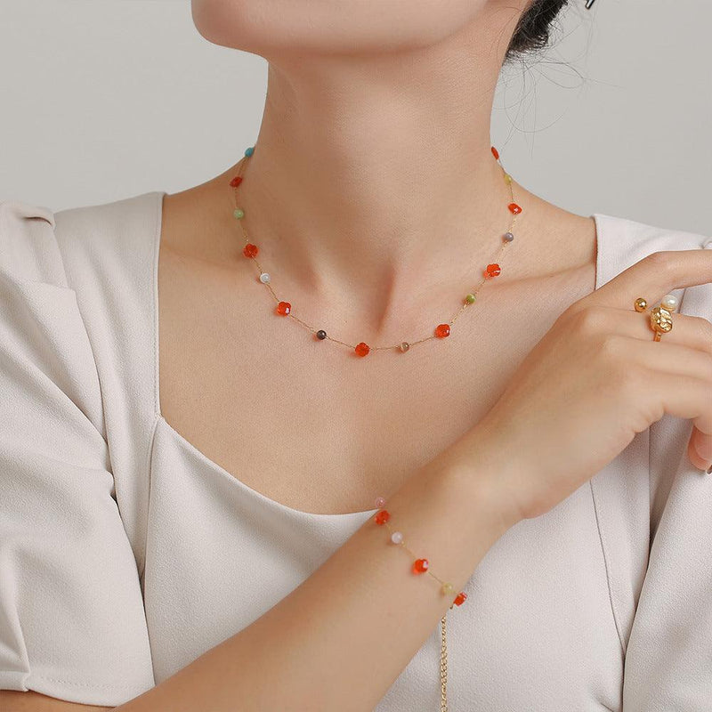 B廠-歐美ins風多彩天然石鎖骨項鍊手鍊 不鏽鋼小眾多巴胺手工鏈套裝女「TXP124-TXE124」24.09-2