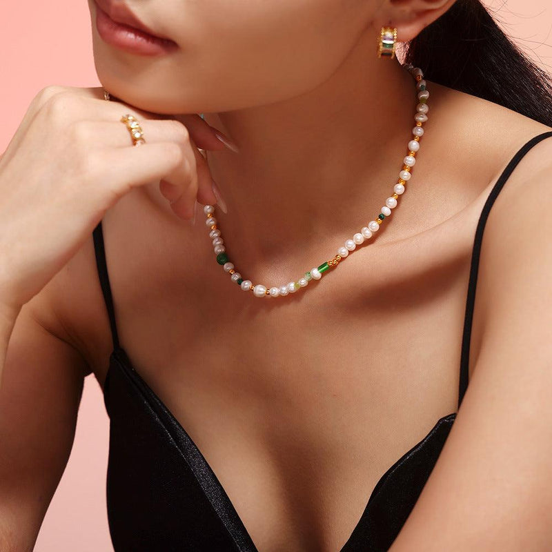 B廠-歐美ins風天然石串珠淡水珍珠吊墜鎖骨項鍊小清新輕奢感項飾品女「P1703」24.09-3