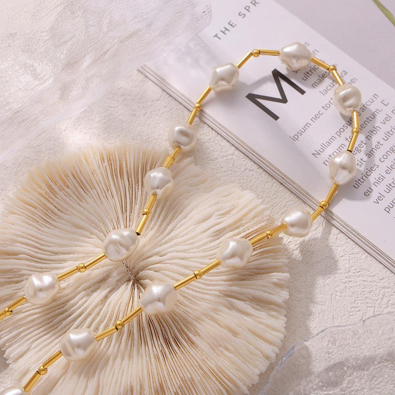 B廠-跨境新款仿珍珠百搭鎖骨鈦鋼項鍊法式復古串珠拼接項飾鍍18k真金「P049」24.07-4