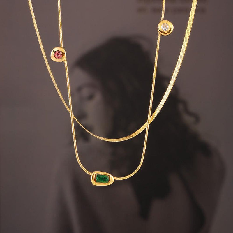 B廠-歐美復古三色玻璃石吊墜鎖骨鏈女輕奢小眾疊戴風鈦鋼鍍18k金飾品「P1876-P1694」24.07-3